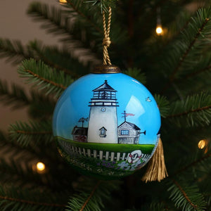 Coastal Lighthouse Hand Painted Blue Green And White Glass Ball Ornament