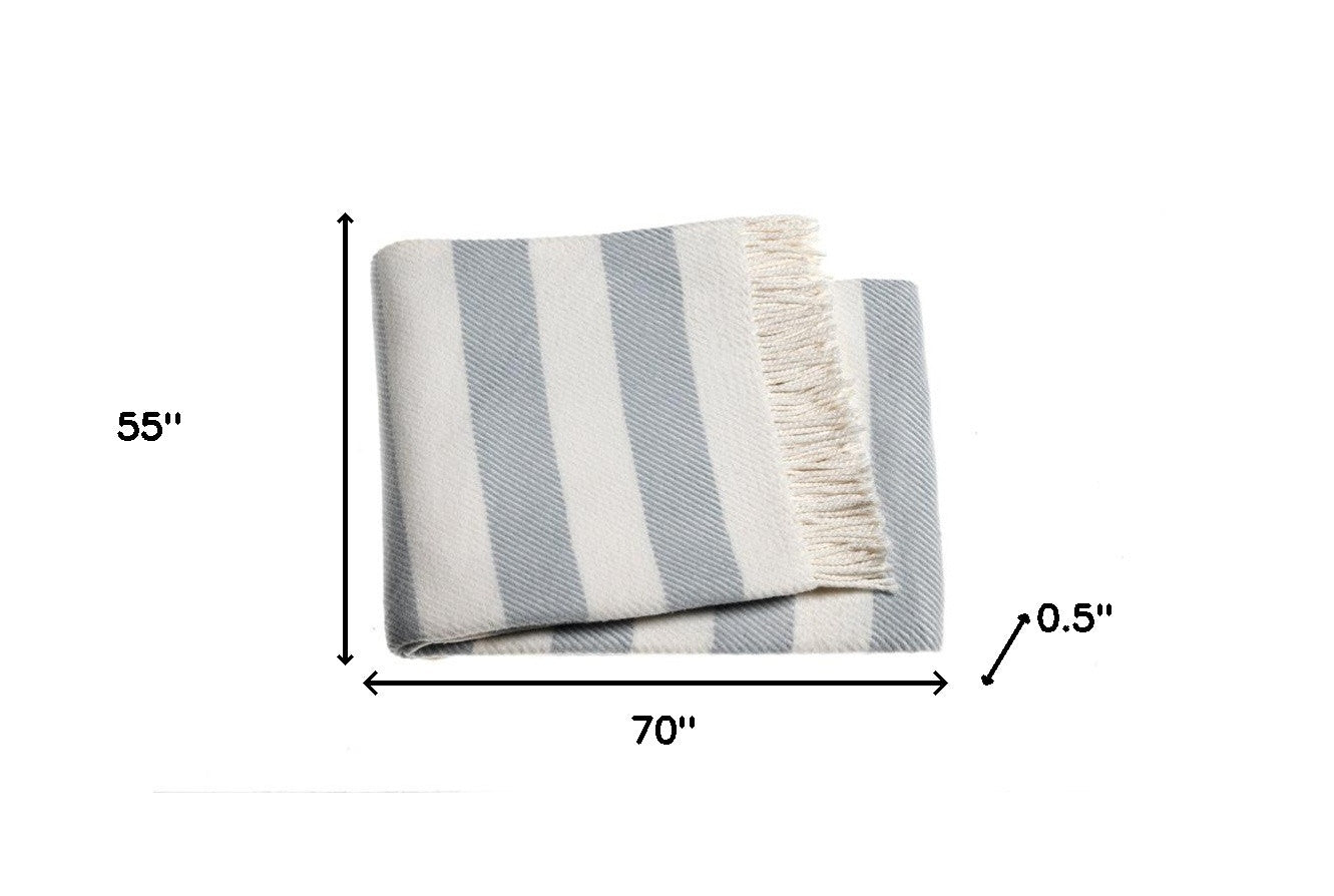 Cream and Sky Blue Slanted Stripe Fringed Throw Blanket