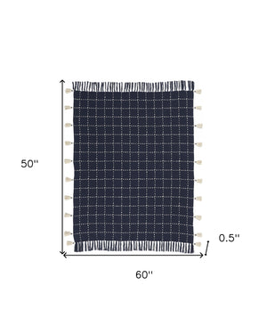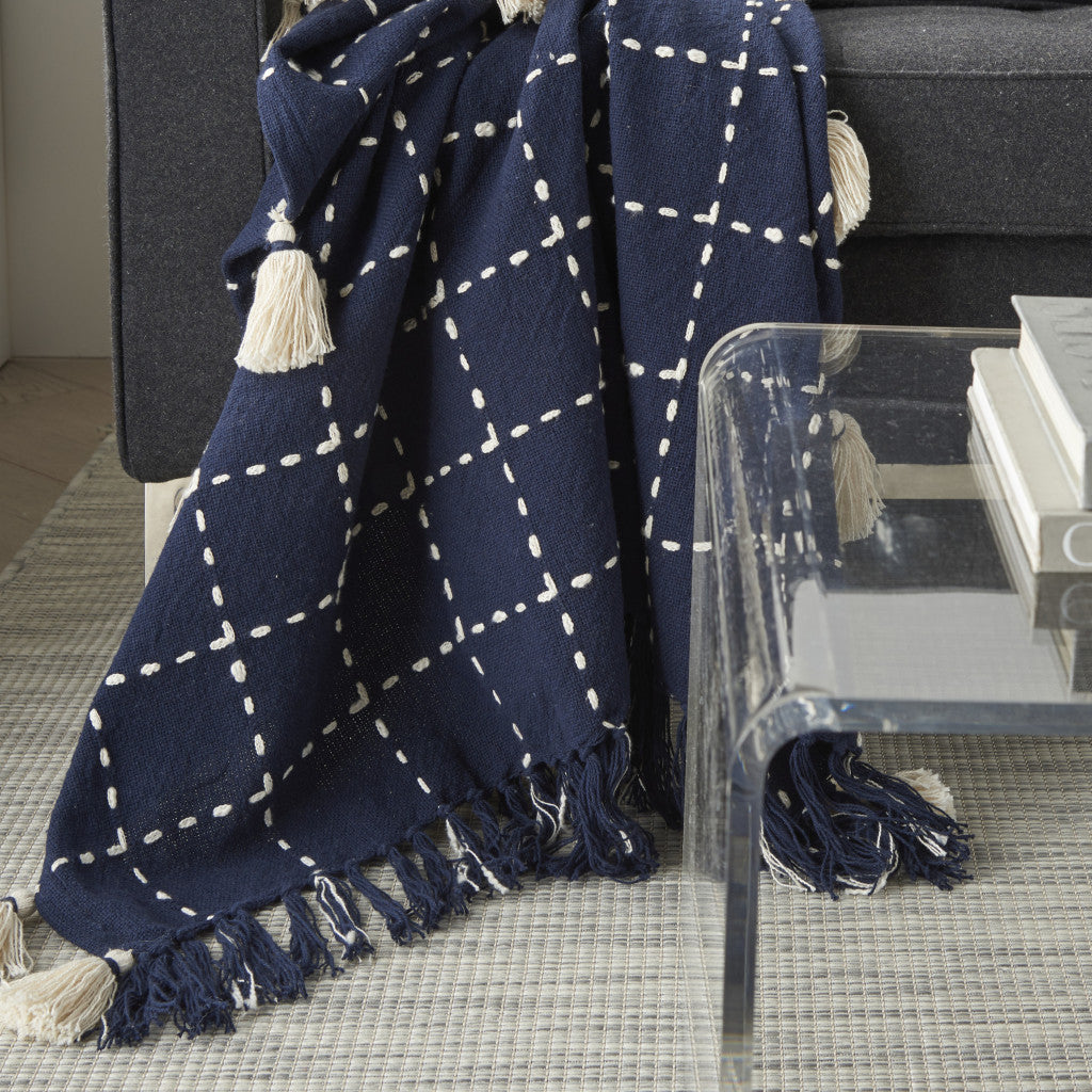 Navy And White Stitched Square Pattern Cotton Throw Blanket