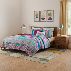 Set of Five Purple And Ivory Striped Queen Ring Stitch Sham And Comforter