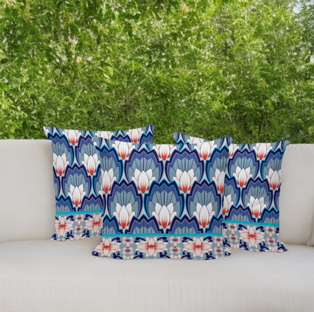 Set of Three 16" Blue and Orange Botanical Indoor Outdoor Throw Pillow Cover and Insert