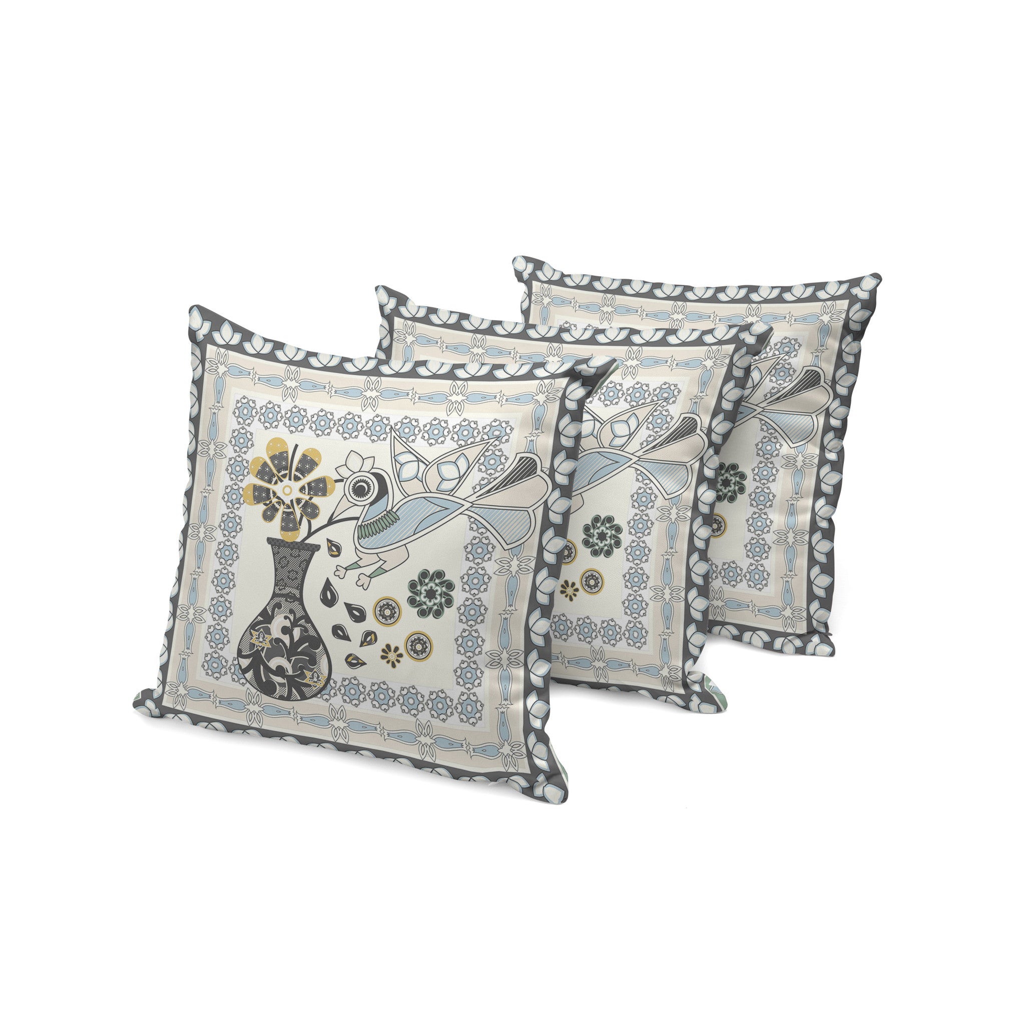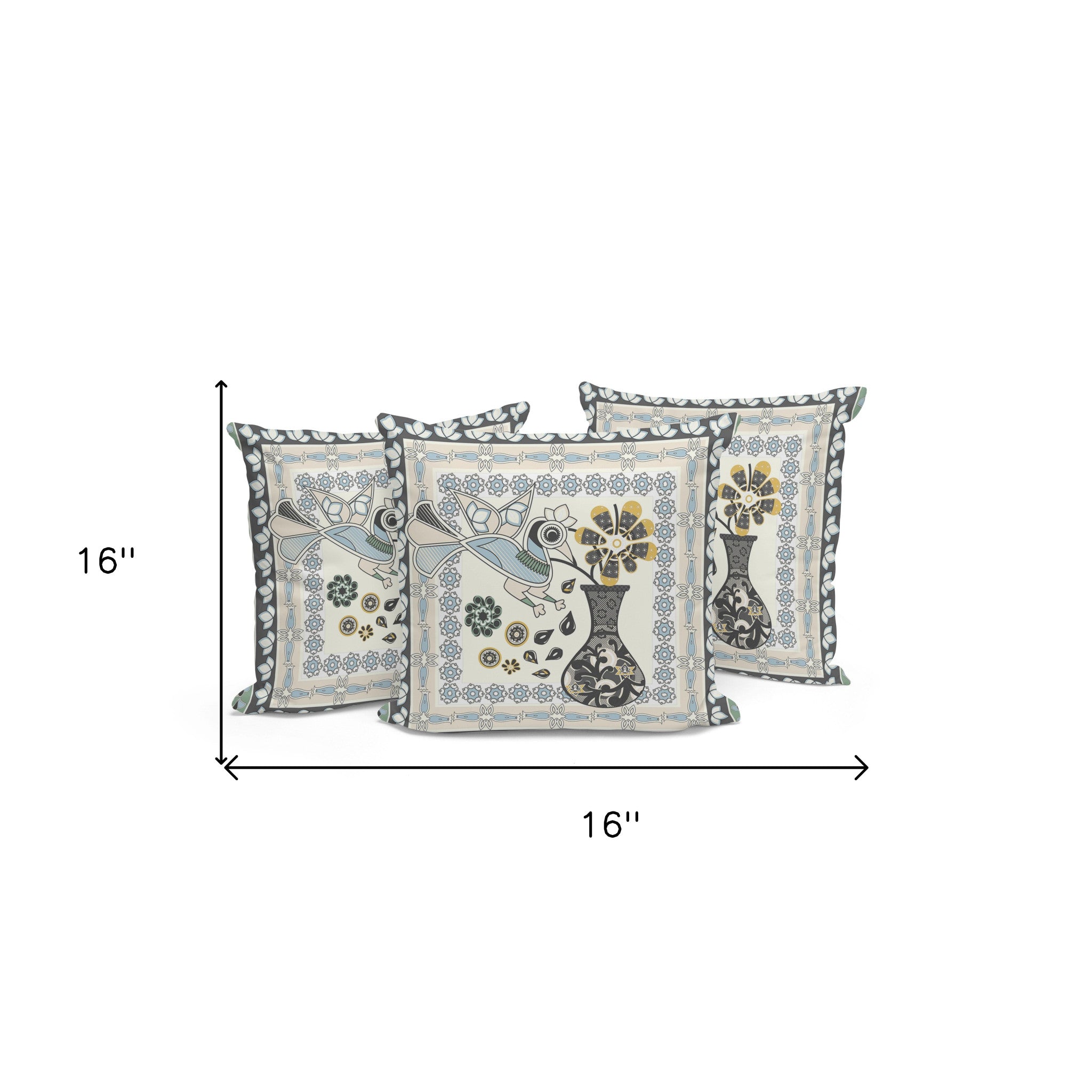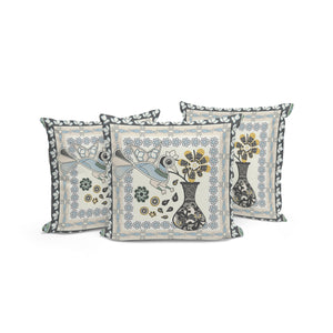 Set of Three 16" X 16" Black and Gray Peacock Blown Seam Floral Indoor Outdoor Throw Pillow