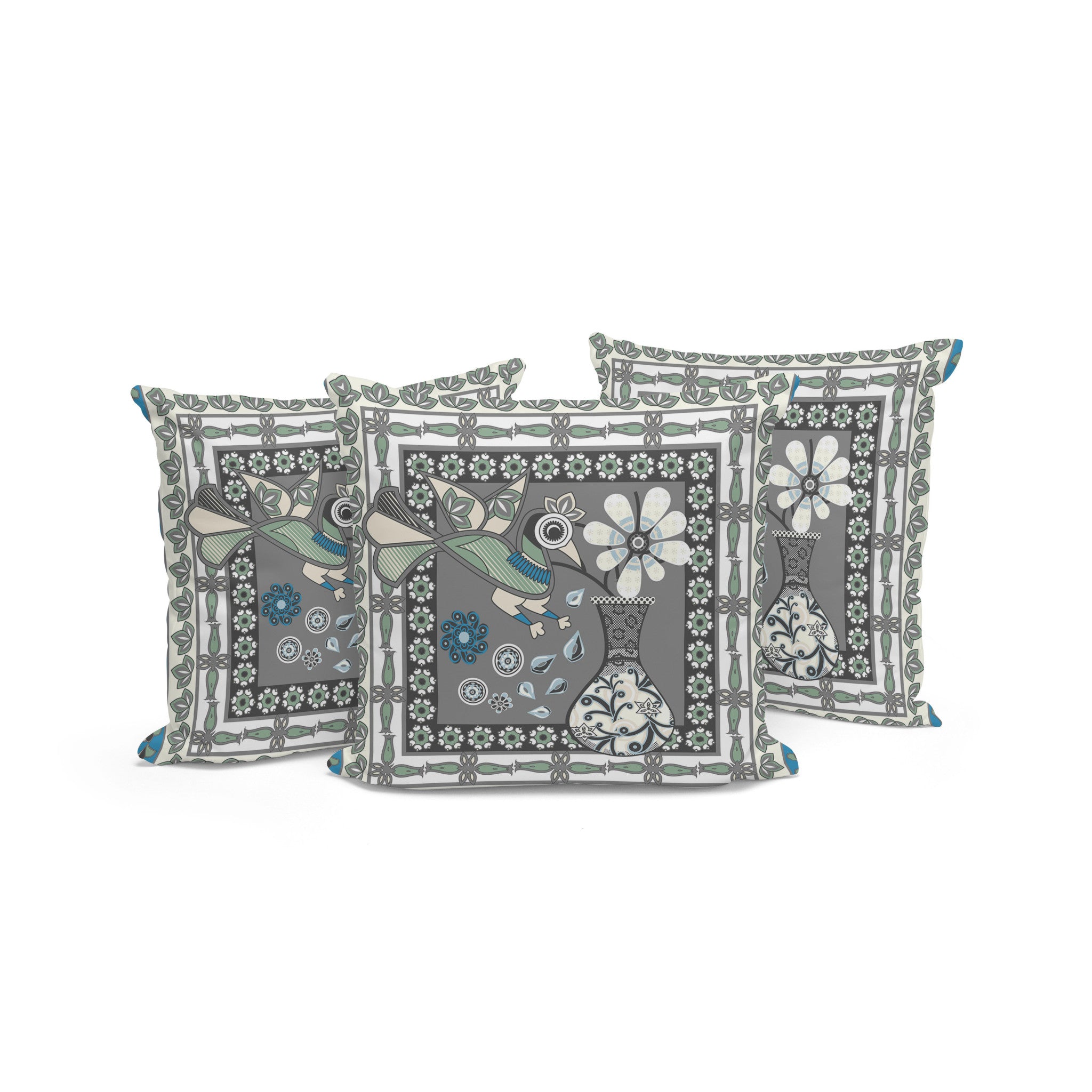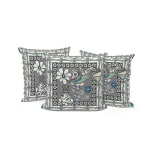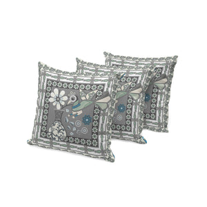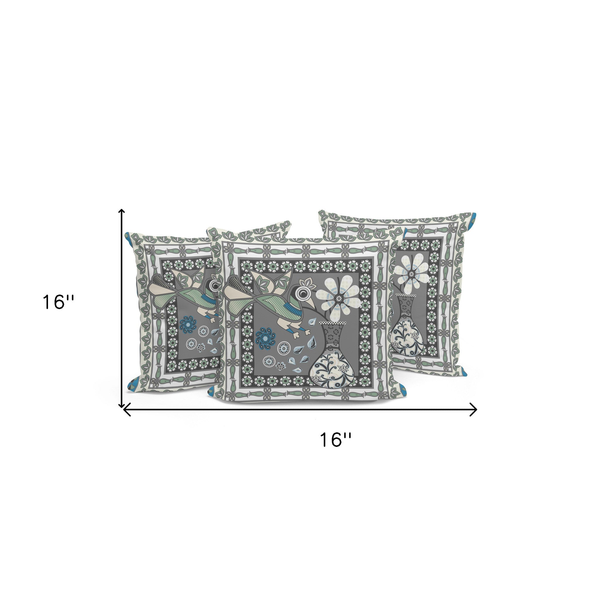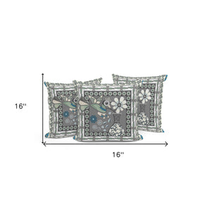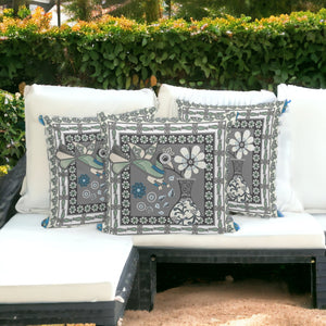 Set of Three 16" X 16" Black Gray and White Peacock Blown Seam Floral Indoor Outdoor Throw Pillow