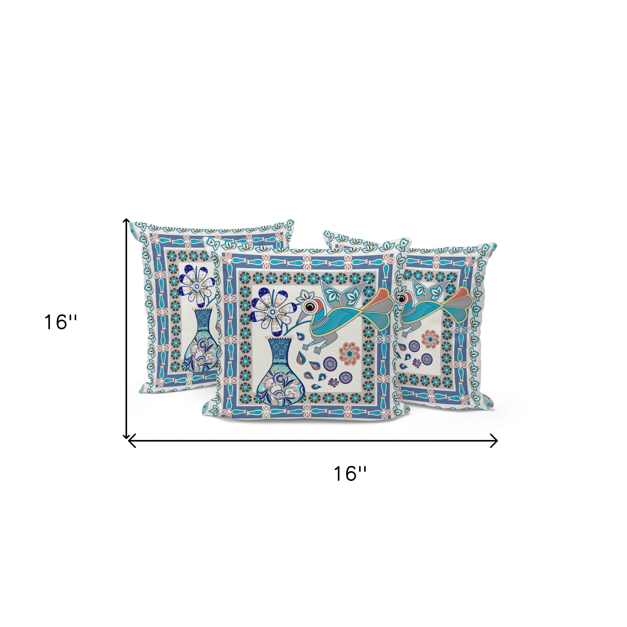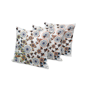 Set of Three 16" X 16" Blue and Off White Peacock Blown Seam Floral Indoor Outdoor Throw Pillow