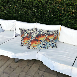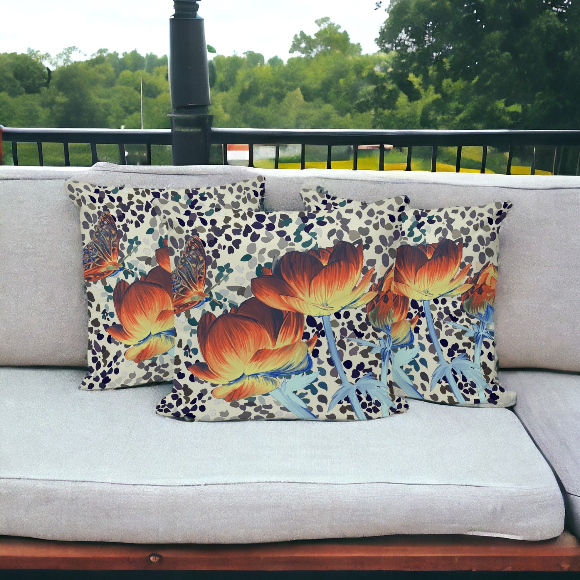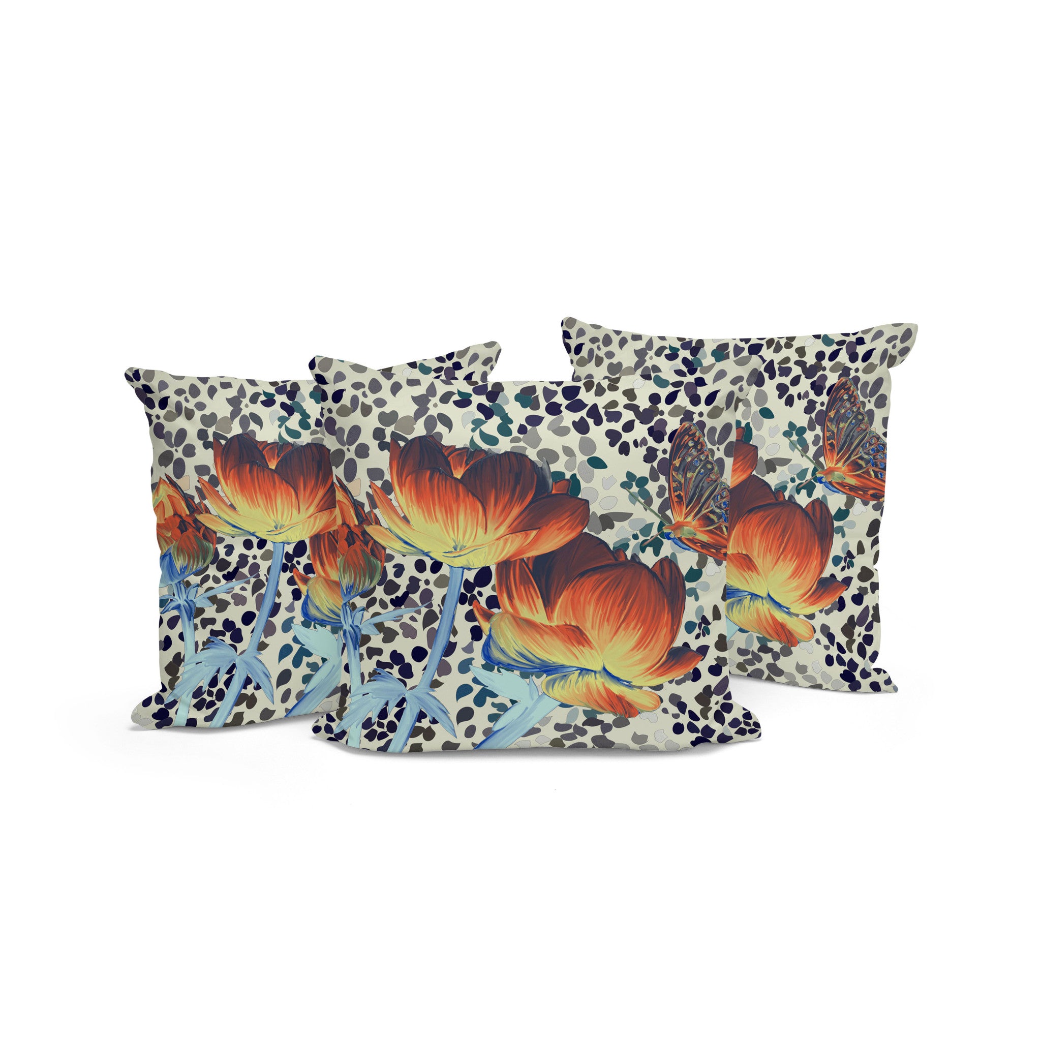 Set of Three 16" X 16" Blue and Orange Butterfly Blown Seam Floral Indoor Outdoor Throw Pillow