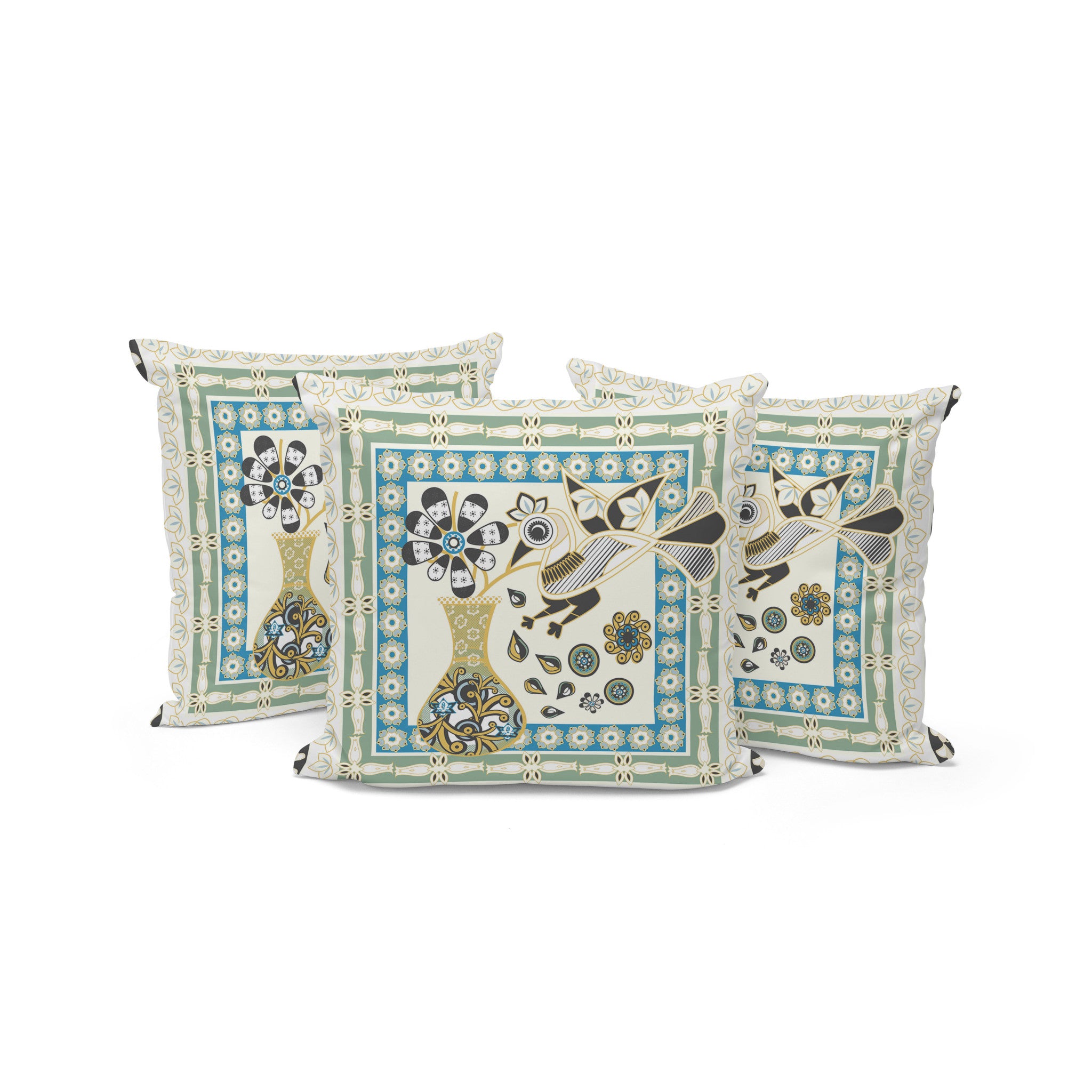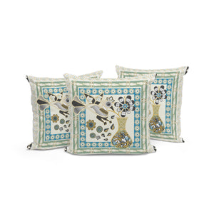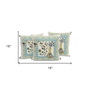 Set of Three 16" X 16" Blue and Yellow Peacock Blown Seam Floral Indoor Outdoor Throw Pillow
