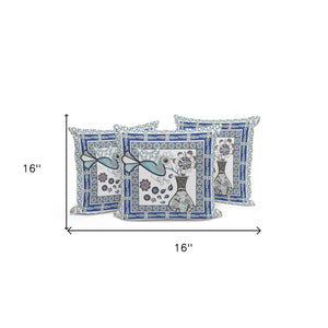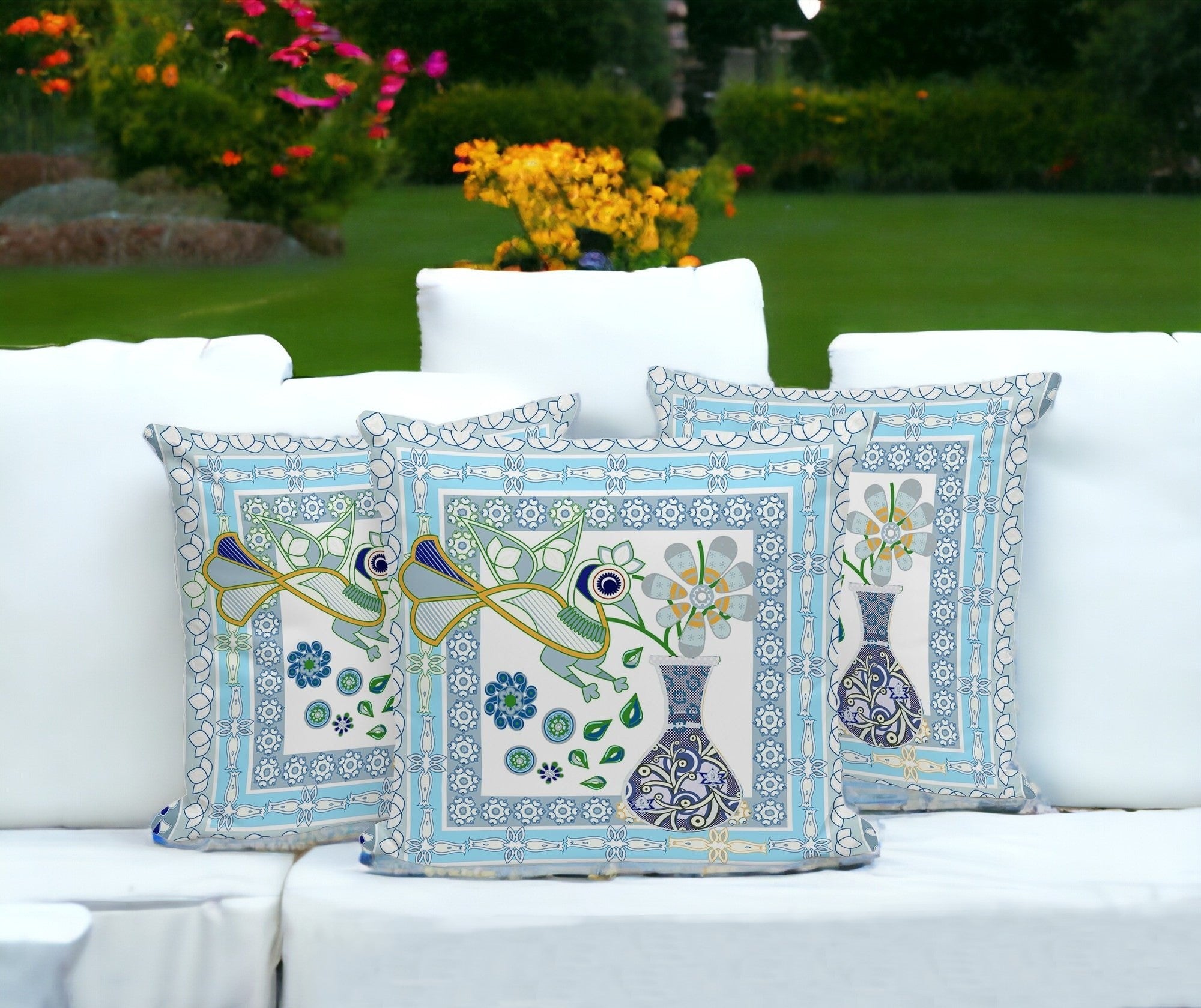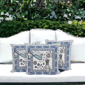 Set of Three 16" X 16" Gray and White Peacock Blown Seam Floral Indoor Outdoor Throw Pillow