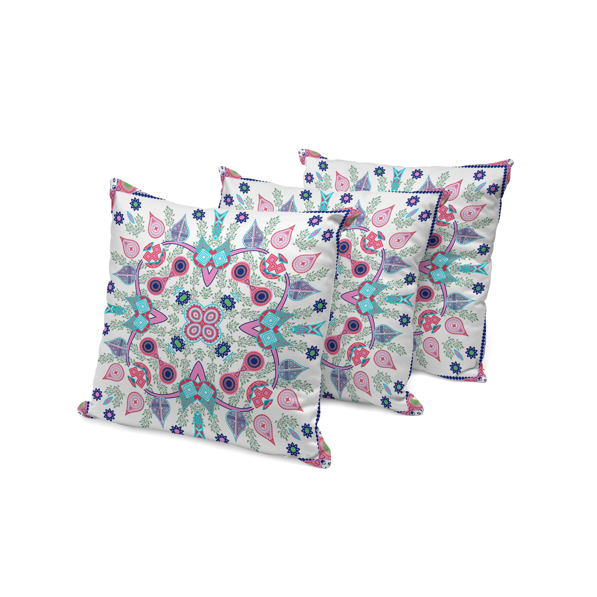 Set of Three 16" X 16" Pink and White Blown Seam Paisley Indoor Outdoor Throw Pillow