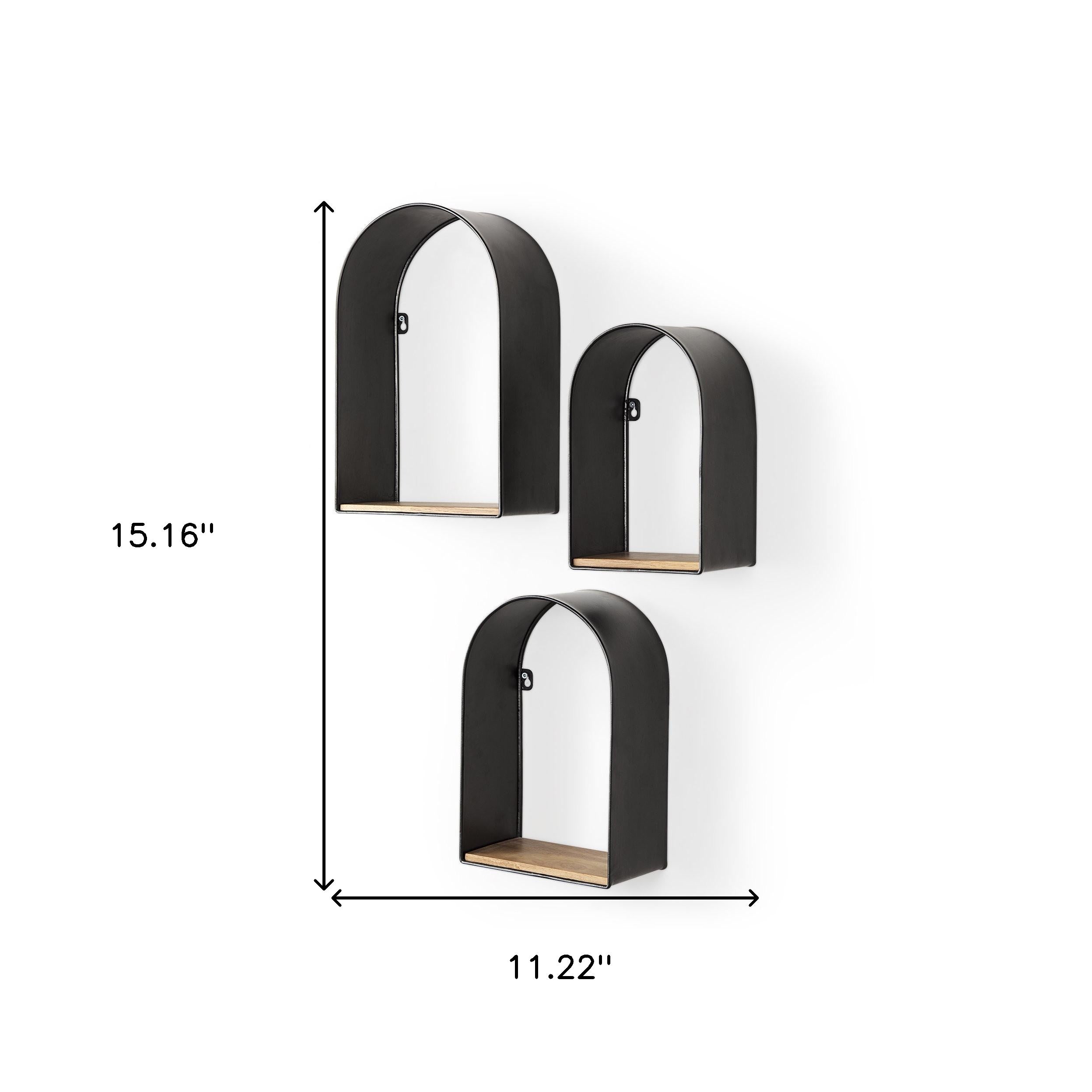 Set Of Three Black And Brown Metal And Solid Wood Arched Wall Mounted Accent Shelf