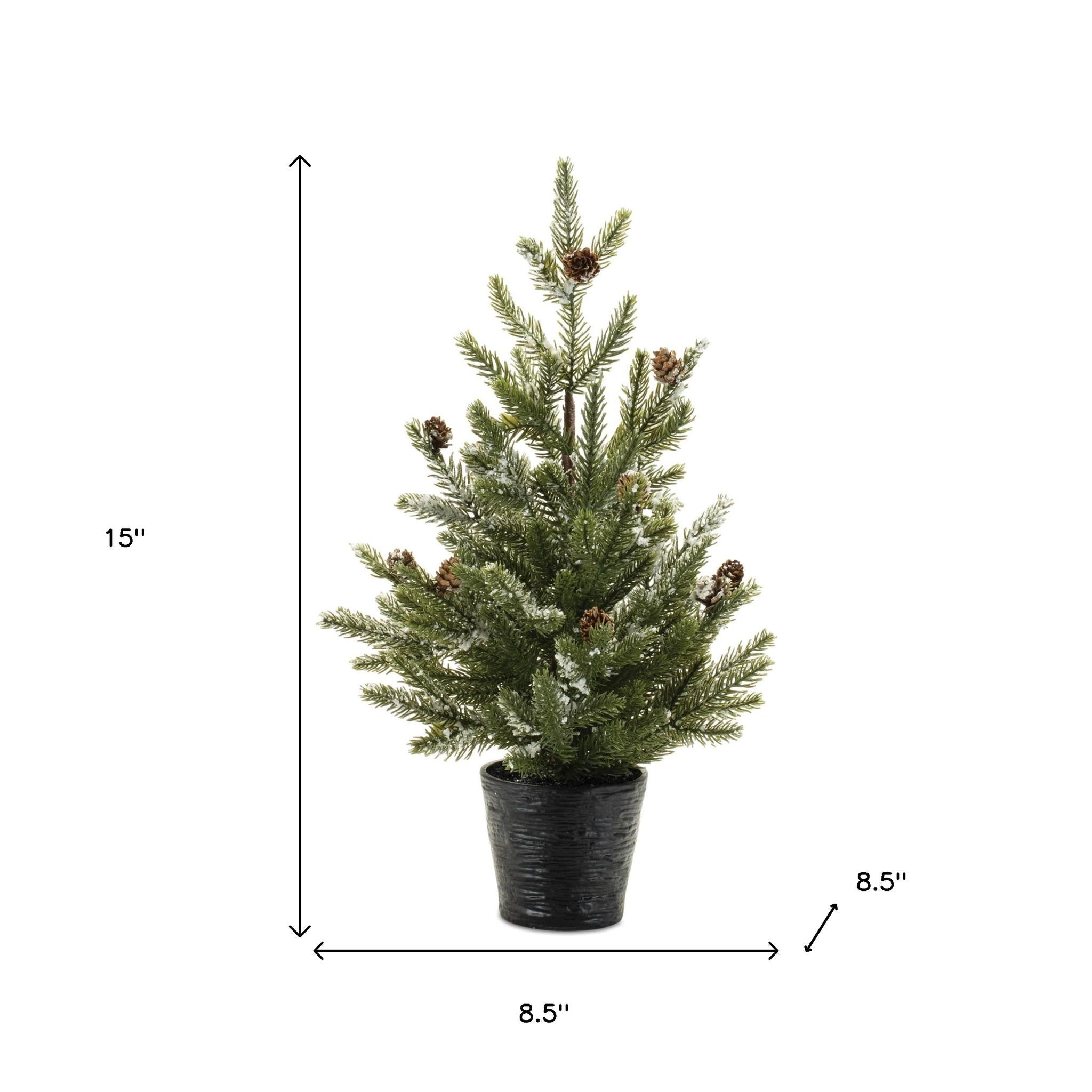 Set of Two 15" Green Mini Artificial Pine Trees With Pinecones In Round Black Metal Pots