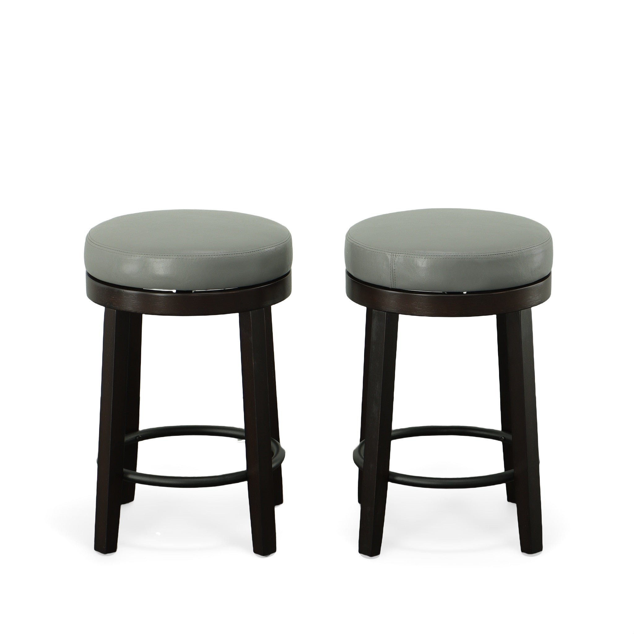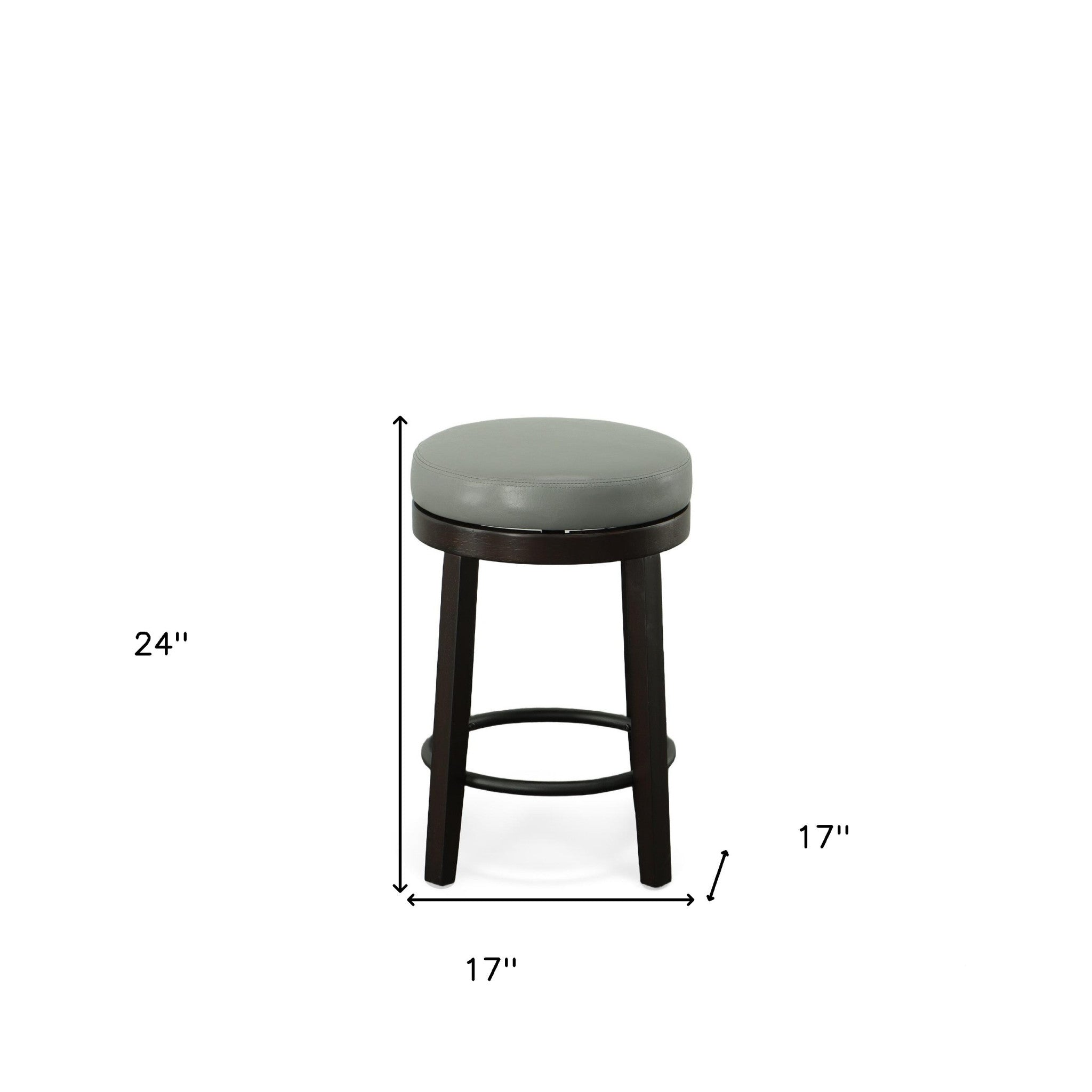 Set of Two 24" Gray and Espresso Faux Leather and Solid Wood Backless Counter Height Swivel Bar Chairs