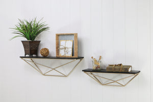 Set Of Two Black And Gold Wood And Metal Modern Wall Mounted Accent Shelves