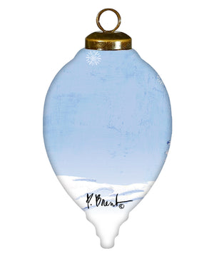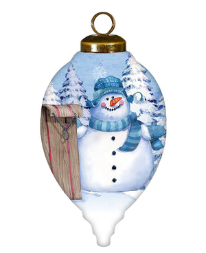 Sled Snowman Hand Painted White Blue And Brown Glass Finial Ornament